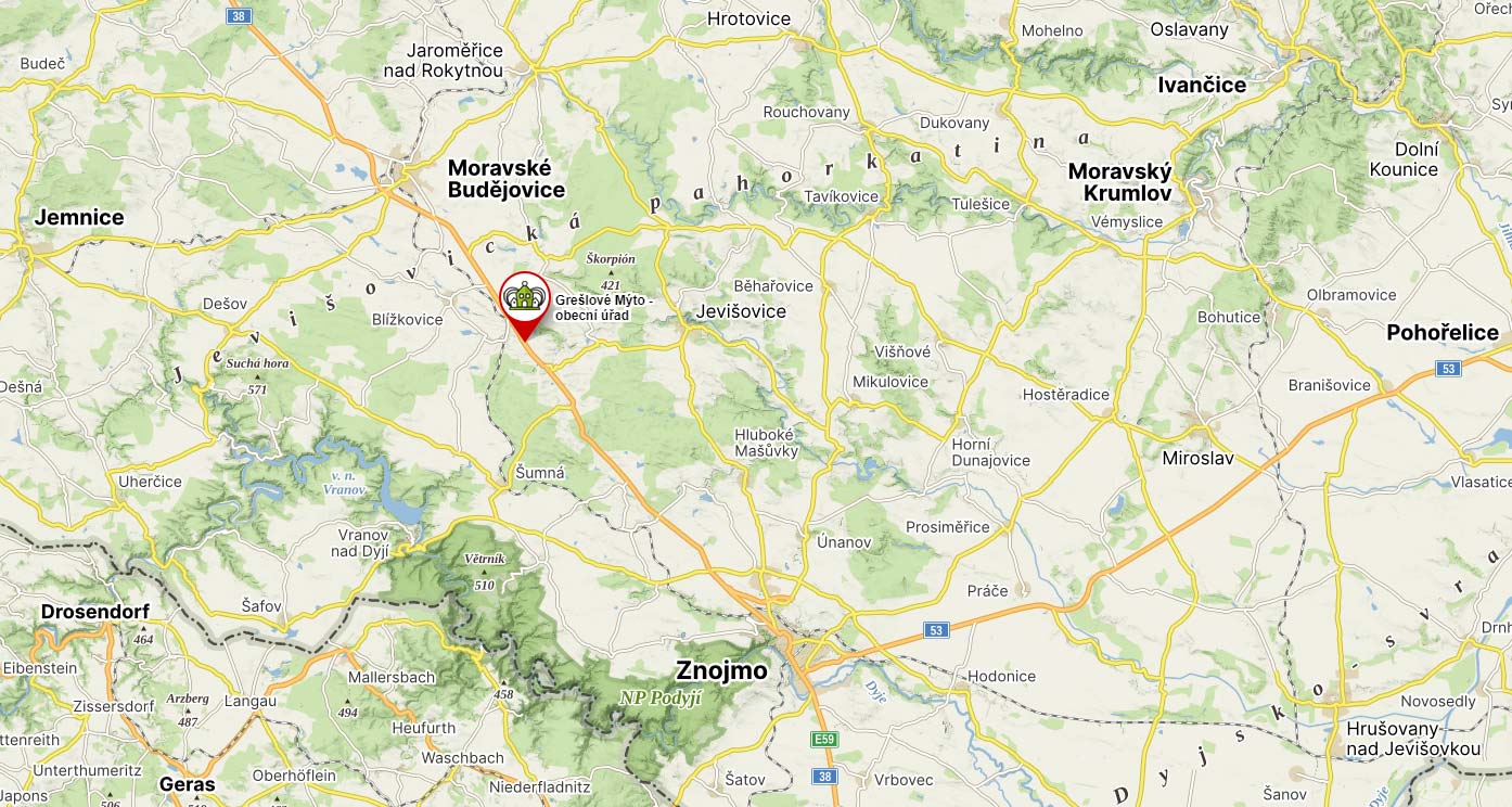 Obec Grešlové Mýto se nachází v okrese Znojmo. Leží přibližně 18 km /